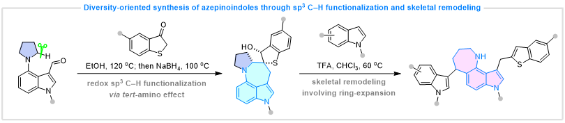 含氮杂环的合成与转化一直是有机合成化学和药物化学领域的研究热点。针对吲哚并氮杂卓这类重要含氮杂环的多样性合成挑战,本研究创新性地融合了四氢吡咯的周边编辑与骨架编辑策略,开发了乙醇介导的氧化还原型sp3 C-H官能化反应以及三氟乙酸促进的骨架重塑反应,实现了吲哚-3,4-并氮杂卓和吲哚-4,5-并氮杂卓的高效、多样性合成。该方法具有无金属参与、官能团兼容优异、操作简便、适用于药物分子后期修饰等优点,不仅拓展了饱和氮杂环骨架编辑的合成工具箱,也为活性药物筛选提供了新颖的化合物库。