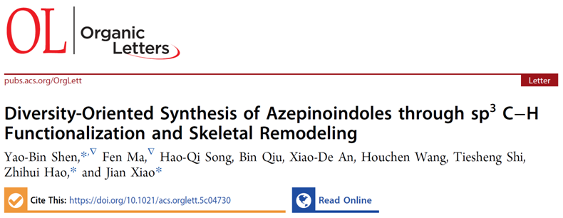 近日,我校化学化工与材料科学学院“化学生物学创新团队”沈耀滨博士在有机合成化学领域取得最新进展。相关研究成果以《Diversity-Oriented Synthesis of Azepinoindoles through sp3 C−H Functionalization and Skeletal Remodeling》为题,发表在国际著名期刊《Organic Letters》(自然指数期刊,中国科学院一区TOP期刊)上。沈耀滨博士为论文第一作者及通讯作者,枣庄学院为第一完成单位。